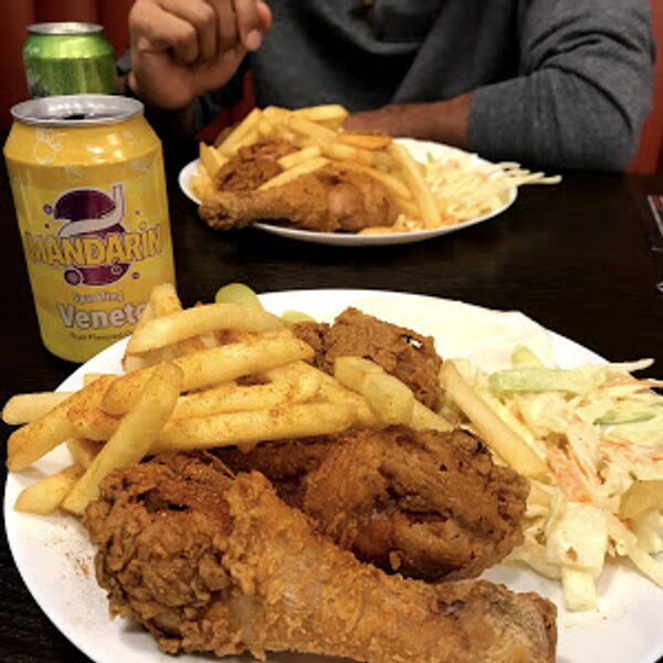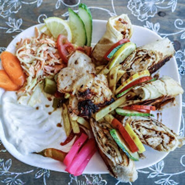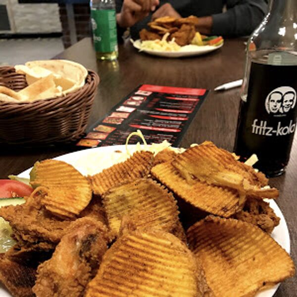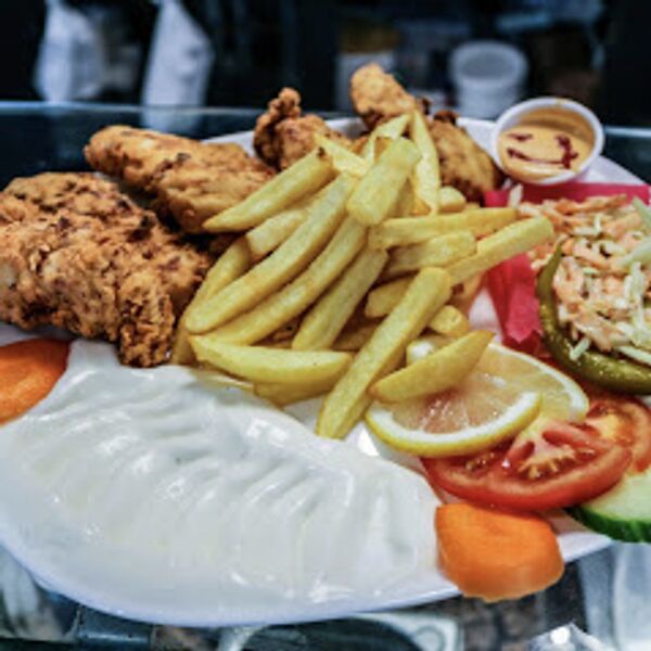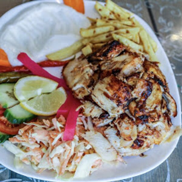 Hähnchenfleisch aus dem Drehspieß, dazu Pommes, Knoblauch-Dip und Cole-Slaw.