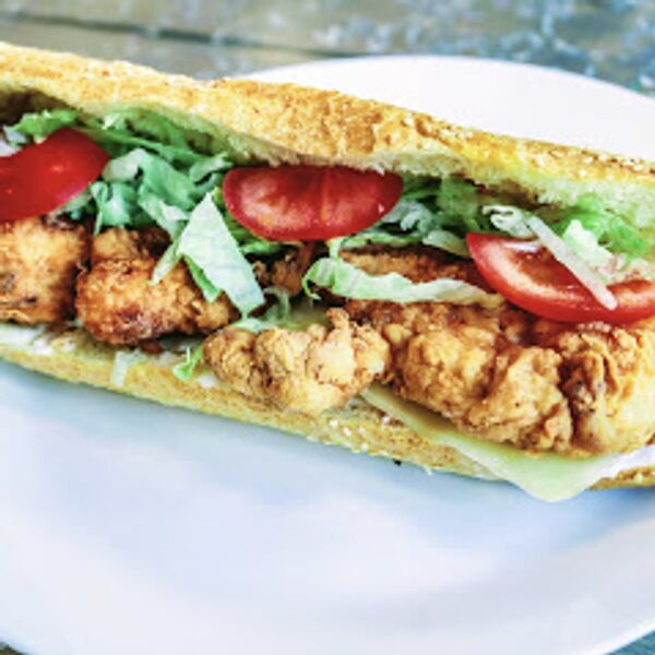 Hähnchenfleisch in Brot gerollt und geschnitten, dazu Pommes, Knoblauch-Dip und Cole-Slaw.