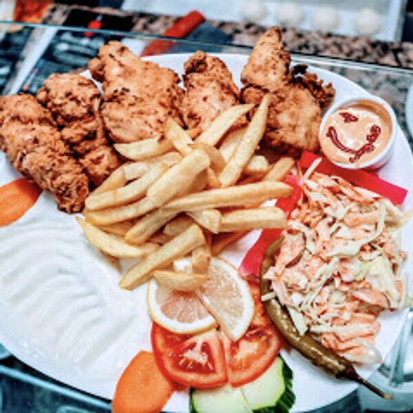 Hähnchen – Filet-Stücke (scharf) mit ColeSlaw, Mayo und Pommes