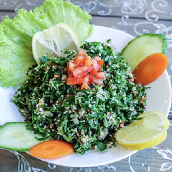 Falafel mit Salat, Brot und Pommes. Dazu Hummus und Zitrone